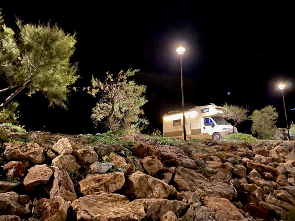 Nous trouvons un endroit génial au bord de la mer pour passer la nuit. La plage est immense et à part quelques pêcheurs, rien ne vient nous perturber. Les critiques de park4night – l’application que nous utilisons le plus souvent pour trouver nos « spots » – étaient mauvaises en particulier à cause de la zone industrielle soi-disant proche, mais nous nous y trouvons très bien.